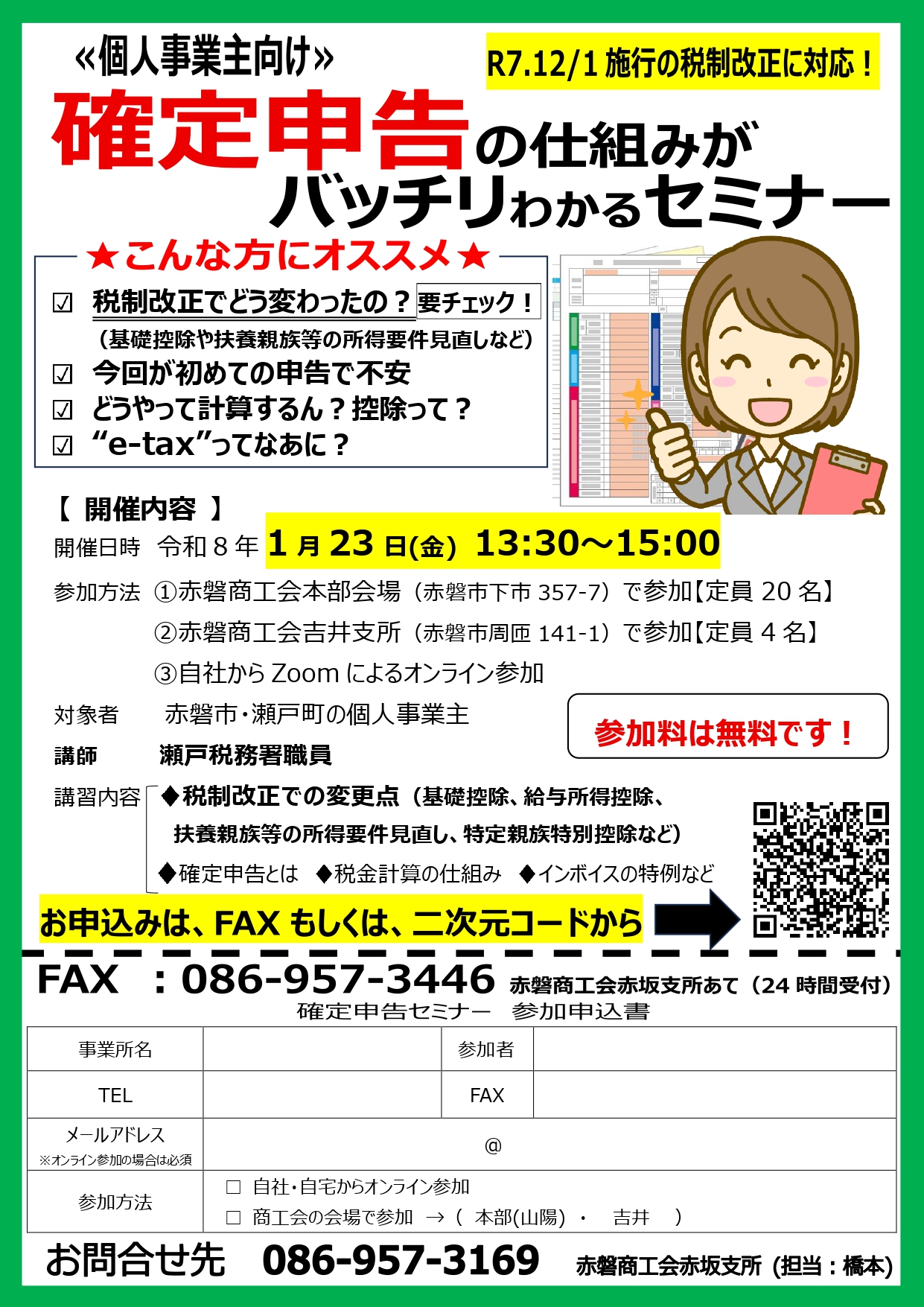今回の申告は、令和7年12月1日施工の税制改正で、控除額や扶養親族等の所得要件見直しなどがありました。このセミナーに参加して、準備しましょう!