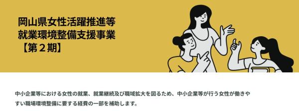 岡山県では、国の「重点支援地方交付金」を活用し、中小企業で女性が働きやすい職場環境整備する「女性活躍推進等就業環境整備支援事業(第2期)補助金 」の申請を受け付けます。